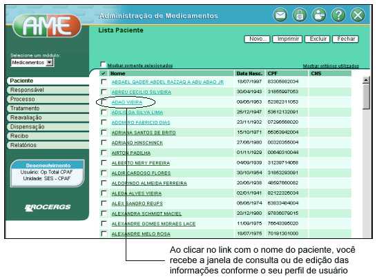 As informações do paciente podem ser acessadas a partir da janela Lista Paciente, que é exibida após a pesquisa retornar registros de pacientes que utilizam medicamentos especiais ou excepcionais, conforme critérios informados na janela Pesquisa Paciente. Caso a pesquisa encontre somente um paciente, você recebe diretamente a janela de consulta ou de edição de paciente.