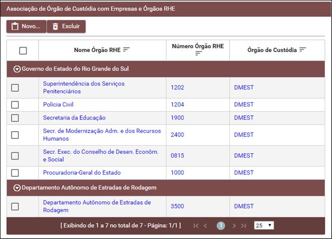 Clique neste botão para incluir uma associação de órgão de custódias com empresas e Órgãos RHE. Para mais informações consulte o tópico Nova Associação de Órgão de Custódia com Empresas e Órgão RHE. |