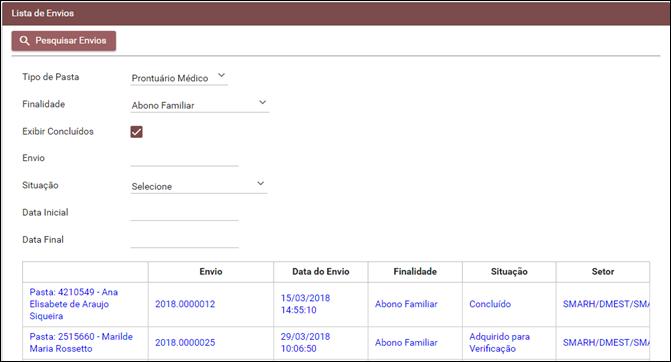 Janela Lista de Envios - Resultado